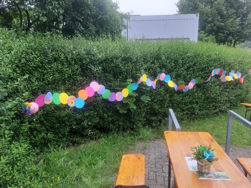 Kinder, die auf dem Sommerfest waren, haben mit Astrid Uebe und Karin Pollak diesen herrlich bunten und 6,60 m langen Bücherwurm gebastelt. Jetzt hängt der Bücherwurm in der Bücherei.