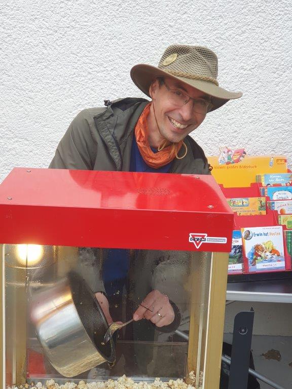 Mit einer Popcorn-Maschine wurde selbstgemachtes Popcorn hergestellt und fand viele Abnehmer, weil es sehr lecker war!