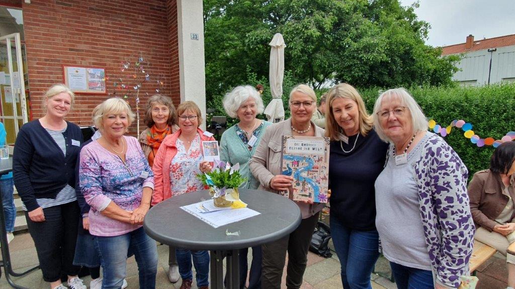Tatjana Jenzen, Inhaberin der Buchhandlung Clowns & Helden in Waggum, brachte zum Jubiläum ein Kinderbuch für die Bücherei mit. Aus dem Bücherei-Team (von li nach re) Sybille Pieles, Renate Behr, Gudrun Wittkowski, Simone Hering, Anne Strecha, Heike Löffler-Schrimpf und Astrid Uebe, mit dem Buch Tatjana Jenzen.
