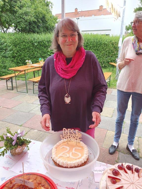 Anlässlich des Jubiläums hat das Team der Bücherei am 2. Juni von 14 bis 18 Uhr ein Sommerfest mit buntem Programm vor der Bücherei gestaltet. Für Feste der Bücherei sind die selbstgebackenen Kuchen und Torten mittlerweile schon bekannt und beliebt. Eine große Freude für das Team war das Geschenk von Antje Ute Möhle: eine Jubiläumstorte!