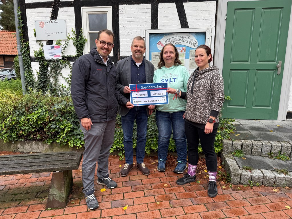 Am 26.09.24 konnten die Pastoren der beiden Kirchengemeinden Pfr. Benedikt Sacha (St. Lukas) und Thomas Ebel (Evangelische Freikirche Querum) den gemeinsamen Spendenerlös des Weihnachtsmarktes 2023 in Höhe von 623,87 € an Svenja Thümen und Riccarda Cichy vom Kinder- und Jugendzentrum Querum übergeben.