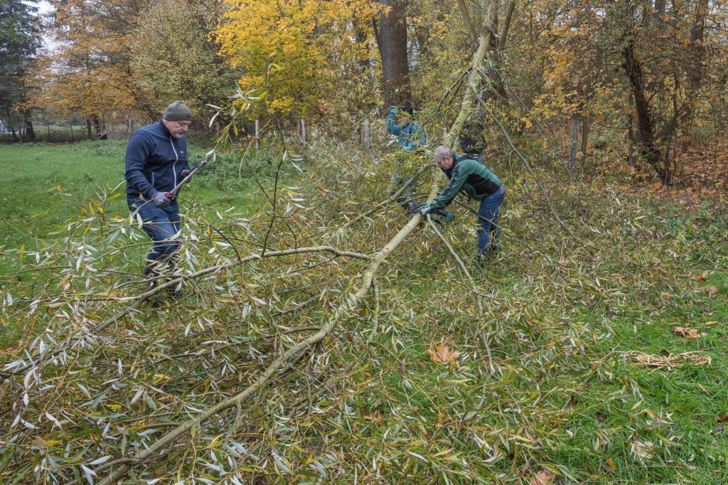 Die Aufgabe der zweiten Gruppe war es, zwei Kopfweiden direkt am Haus Entenfang zurückzuschneiden, sie zu „köpfen“. Durch das Rückschneiden bilden sich die typischen Köpfe unserer Kopfweiden, die früher in unserer Landschaft häufiger waren, im Naturschutzgebiet aber an vielen Stellen vorhanden sind und auch neu gepflanzt werden. Die abgesägten Äste wurden anschließend in die Außenanlage des Hausen Entenfang gebracht, um in das dort vorhandene Spiel- und Schauobjekt „Entenfanganlage“ eingeflochten zu werden. Das alte Flechtwerk war schon entfernt worden und wurde nun erneuert.