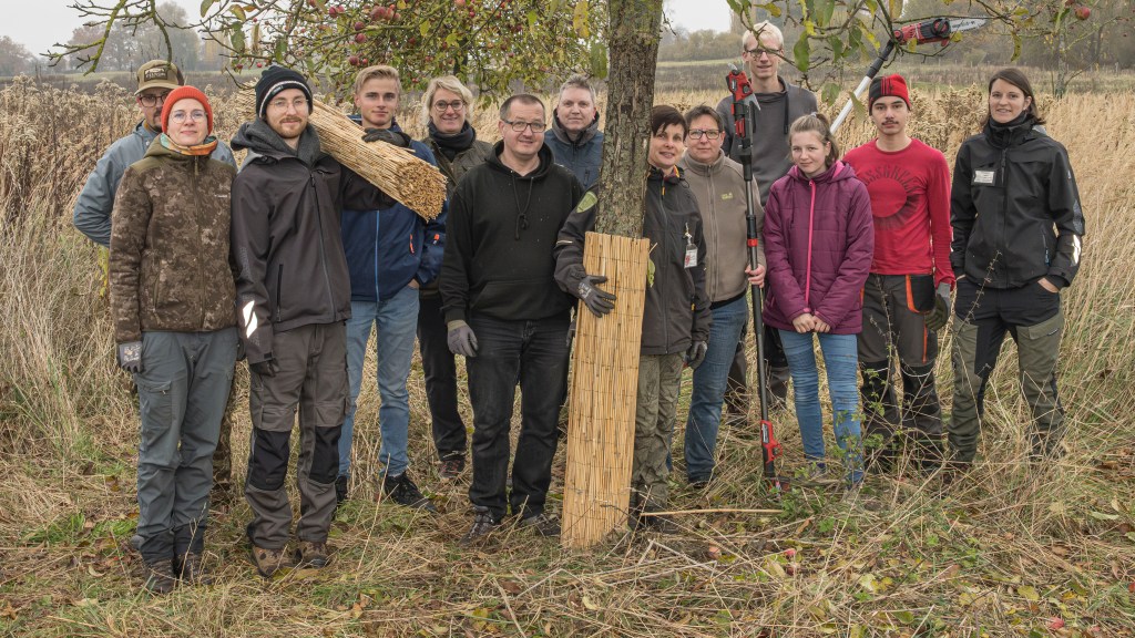 Gruppe vier fuhr zu einer Streuobstwiese ganz im Osten des Naturschutzgebietes nahe dem Ortsrand von Weddel. Hier stehen zahlreiche Apfelbäume. Die Fläche wird regelmäßig mit Schafen beweidet. Der vorhandene metallene Wildschutzzaun war jedoch in den vergangenen Jahren an mehreren Stellen zerstört worden und von Gras überwuchert, viele Pfosten waren abgebrochen. Der Zaun sollte abgebaut und die vorhandenen Pfosten entfernt werden, was leichter gesagt als getan war. Festsitzende Pfosten und vor allem der schon an vielen Stellen in die Erde eingewachsene Zaun machten es notwendig, eine Maschine zu Hilfe zu holen. Nur durch den Einsatz eines Traktors gelang es, den Zaun vollständig zu entfernen. Gleichzeitig begann ein Teil der Gruppe damit, den alten, teilweise verwachsenen Verbissschutz um die Obstbaumstämme zu entfernen und durch das Umbinden mit Schilfmatten zu ersetzen. Außerdem waren die Obstbäume in den vergangenen Jahren nicht geschnitten worden. Der regelmäßige Schnitt der Bäume ist jedoch notwendig, um das gesunde Baumwachstum zu fördern und den Bäumen ein möglichst lange Leben zu ermöglichen. Natürlich spielt auch die Förderung der Fruchtbildung eine wichtige Rolle. Stammschutz und Rückschnitt der Obstbäume konnten aber bei weitem noch nicht abgeschlossen werden, sodass sich hier schon die nächste Frühjahrsaktion im Naturschutzgebiet andeutet.