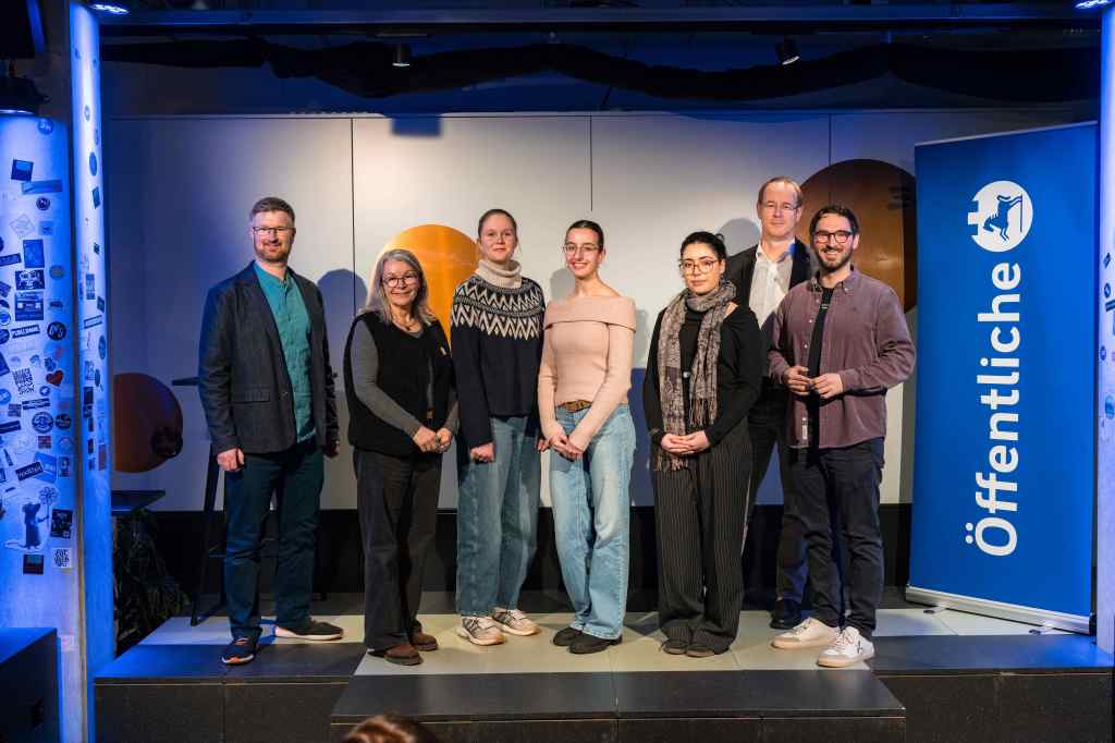 Die drei Gewinnerinnen des regionalen Rhetorikwettbewerbes: Sophia Turnier (Lessinggymnasium, 3. von links), Jalia Gonschior (Lessinggymnasium, rechts daneben) und Nila Atakül (Hoffmann-von-Fallersleben-Schule, rechts daneben) mit Sebastian Heise von der Öffentlichen (ganz links) und den Jurymitgliedern Marion Thomsen (2. von links), Guido Stolle (2. von rechts) und Falk-Martin Drescher (ganz rechts)